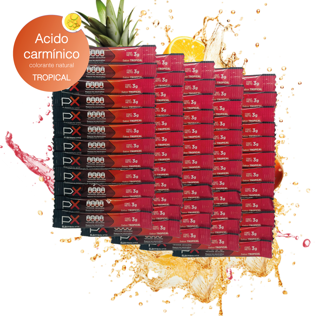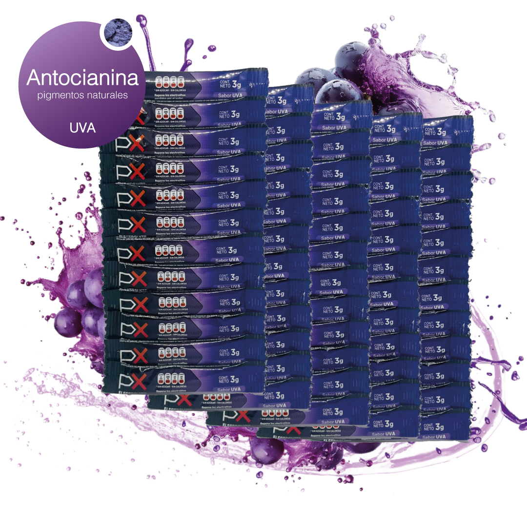 Con solo agregar un sobre de PX ELECTROLYTE en 300 a 600 ml de agua se logra una hidratación adecuada, sin calorías, para consumir en cualquier momento.
